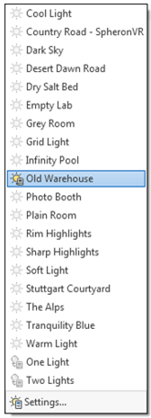 Đối với ví dụ này, chúng tôi sẽ sử dụng Chiếu sáng dựa trên Hình ảnh (Image Based Lighting) và chọn Old Warehouse làm tùy chọn chiếu sáng. Điều này giúp tạo ra một môi trường ánh sáng tự nhiên và phong phú, làm nổi bật các chi tiết trong thiết kế.