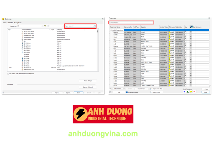 Trước đây, khi vào mục Customize, bạn sẽ gặp khó khăn khi phải tìm ra đúng tính năng cần thiết lập phím tắt trong hàng loạt các công cụ được Inventor liệt kê. Nhận thấy điểm bất cập này, Autodesk đã thêm công cụ tìm kiếm vào Customize. Bây giờ, bạn sẽ nhanh chóng tìm thấy và tùy chỉnh các công cụ thông qua việc nhập các từ khóa vào ô tìm kiếm. Tương tự như Customize, nếu mô hình của bạn chứa quá nhiều tham số thì công đoạn tìm kiếm đúng tham số cần tìm sẽ mất khá nhiều thời gian. Với việc cũng được thêm công cụ tìm kiếm vào cửa sổ Parameters, quá trình này sẽ đơn giản hơn và từ đó tăng cường hiệu quả cho việc quản lý và chỉnh sửa các tham số.