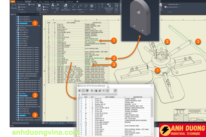 Trong bản cập nhật mới nhất của Autodesk Inventor, một tính năng nổi bật đã được giới thiệu trong môi trường Drawing, mang lại sự tiện lợi và hiệu quả đáng kể cho người dùng. Tính năng này cho phép phần mềm tự động highlight các đối tượng trên bản vẽ dựa vào lựa chọn của người dùng trong danh sách bảng kê (Part List). Khi một đối tượng cụ thể được chọn từ Part List, phần mềm sẽ tự động làm nổi bật đối tượng tương ứng trên bản vẽ và trên thanh browser, giúp người dùng dễ dàng xác định và quản lý các chi tiết. Ngoài ra, tính năng này còn cho phép chọn nhiều đối tượng trên Part List cùng một lúc, từ đó bạn có thể xem các thành phần tương ứng được làm nổi bật trong không gian làm việc. Hơn nữa, khi cú nhấp đúp vào một đối tượng trong Part List, phần mềm sẽ mở chính xác mô hình 3D tương ứng, giúp bạn nhanh chóng thay đổi thiết kế. Tính năng này giúp bạn dễ dàng điều hướng và chỉnh sửa các chi tiết trong bản vẽ và nó đặc biệt hữu ích trong các dự án phức tạp với nhiều thành phần và chi tiết, giúp tối ưu hóa quy trình làm việc và nâng cao hiệu quả thiết kế.