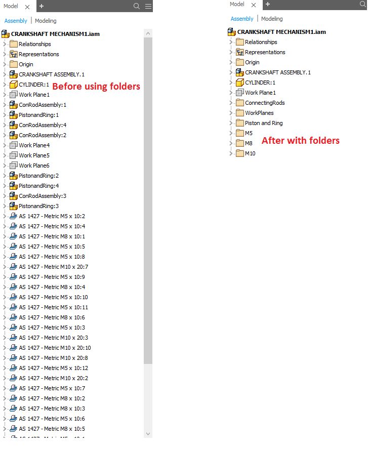Khi thiết kế trong Inventor, bạn có nhiều thành phần giống nhau và gặp khó khăn trong việc điều hướng trình duyệt lắp ráp. Việc tạo các thư mục như “Nuts”, “Bu lông”, “Phụ kiện” trong các mẫu lắp ráp giúp tổ chức và quản lý dễ dàng hơn.
