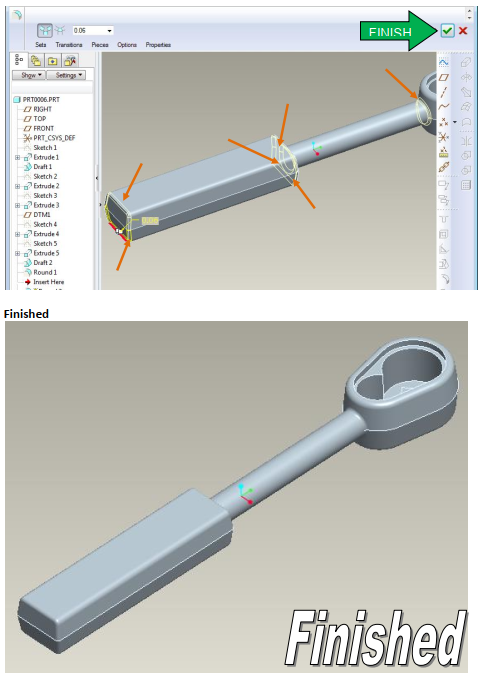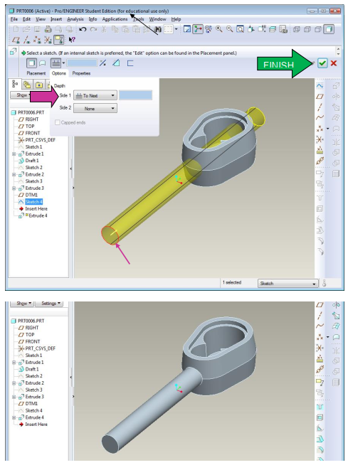 - Sử dụng tùy chọn Up to Next để extrude từ phác thảo tròn lên đến mặt phẳng tiếp theo.