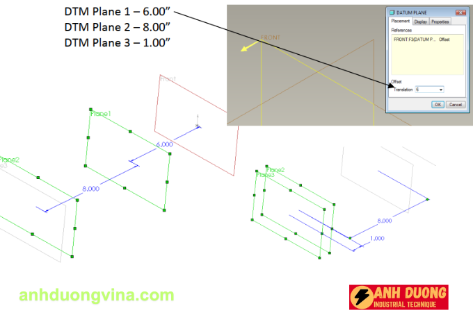 - Tạo bốn mặt phẳng datum bắt đầu từ mặt phẳng Front và offset các mặt phẳng này theo các khoảng cách sau: