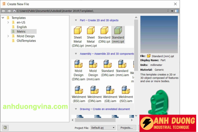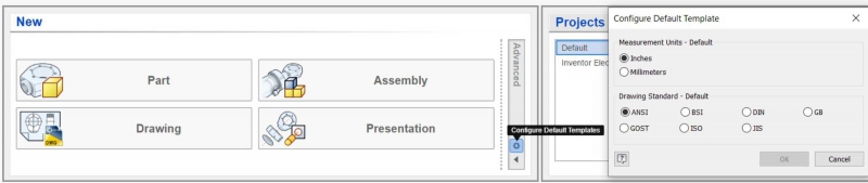 Để tránh tình trạng nhầm lẫn đơn vị khi bắt đầu thiết kế chi tiết, Inventor đã hỗ trợ người dùng dễ dàng sử dụng đúng đơn vị mong muốn bằng cách cung cấp các Templates được phân chia theo đơn vị và tiêu chuẩn đo của các vùng lãnh thổ và khu vực lớn tại mục Create New File.