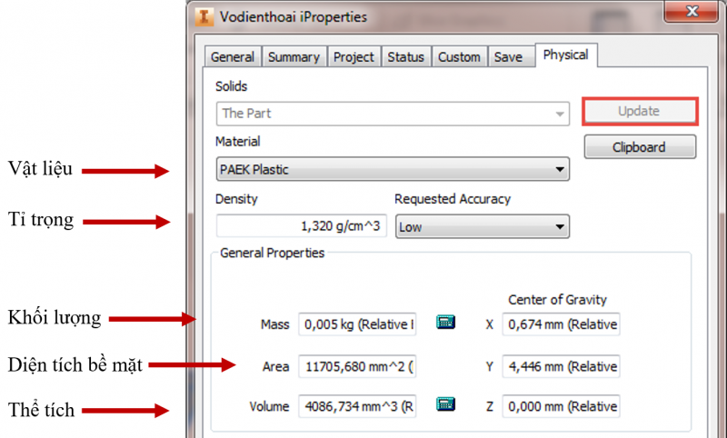 - Nhấn Update để xem các thông số vật lý của chi tiết.