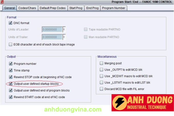 - Tích chọn Output user defined startup blocks để thêm các lệnh G-code vào đầu chương trình.