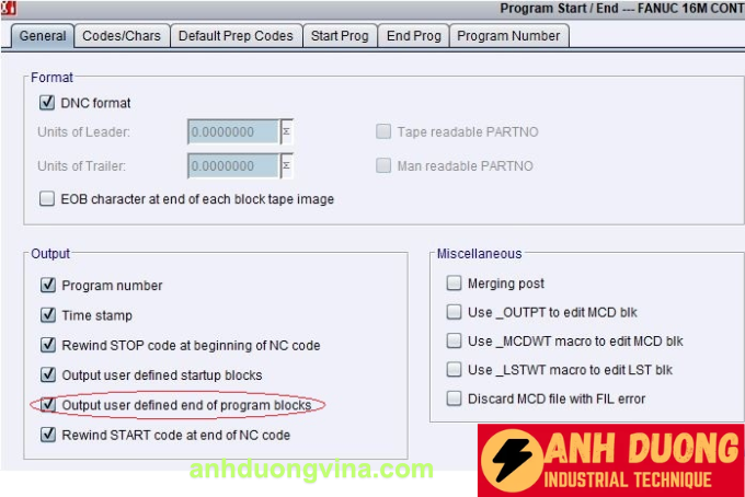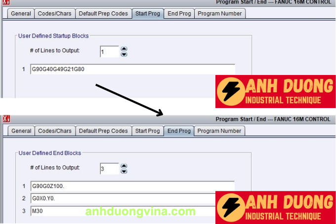 - Chuyển đến tab End Prog trong giao diện sửa chữa Post Processor.