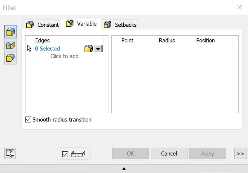 - Variable: Sử dụng tùy chọn này khi bạn muốn bán kính Fillet có thể thay đổi trên đường bo, tạo nên các đường bo không đồng nhất.