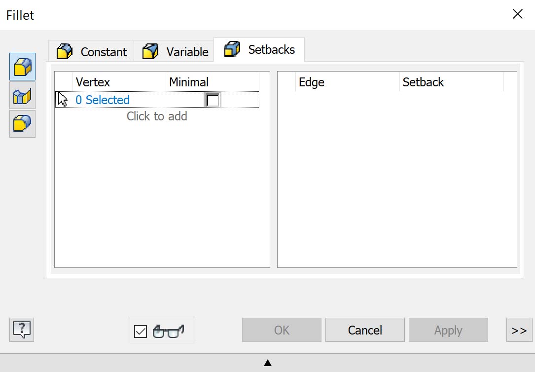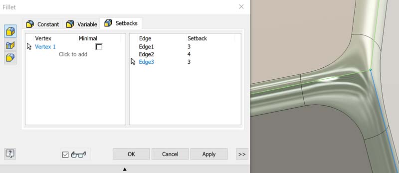 - Setbacks: Chọn điểm giao của các đường bo để điều chỉnh giao tuyến các đường Fillet với nhau. Điều này cho phép bạn thiết lập lại khoảng cách từ điểm giao nhau tới điểm bắt đầu thay đổi bán kính Fillet của từng cạnh