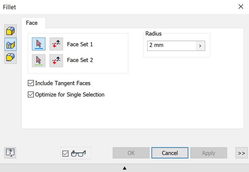 - Face Set 1, 2: Chọn hai mặt giao tuyến để áp dụng Fillet.