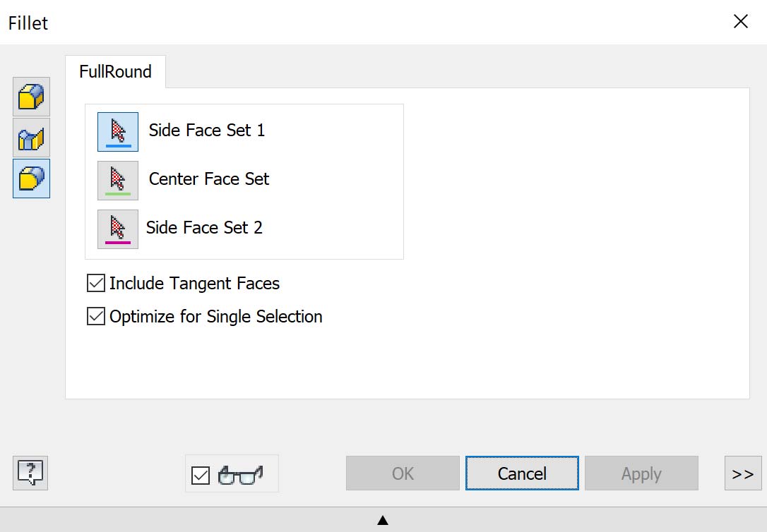 - Full Round Fillet: Áp dụng Fillet tròn đầy đủ quanh một mặt trung tâm giao với hai mặt phẳng khác.