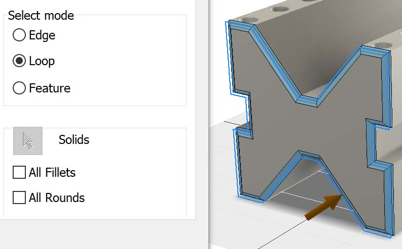 - Loop (Vòng): Chọn tất cả các cạnh tạo thành một đường kín, giúp áp dụng Fillet đồng thời cho toàn bộ vòng cạnh.