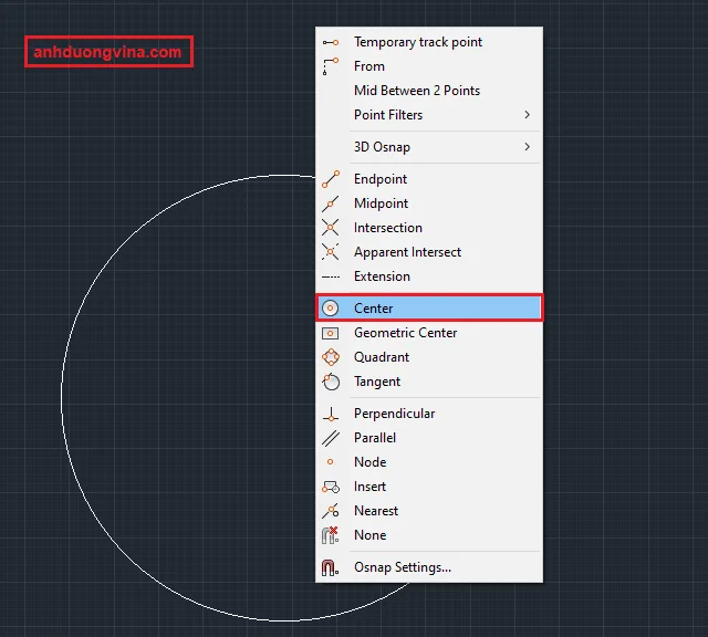 Bước 1 : Chúng ta đè nút Ctrl + Click chuột phải vào màn hình autocad , màn hình autocad sẽ hiện ra thanh công cụ như hình bên dưới và bạn chọn vào Center như chúng tôi khoanh bên dưới