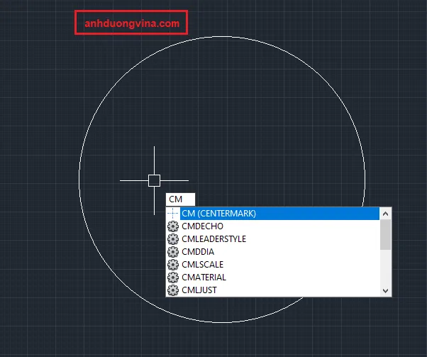 Bước 1 : Gõ lệnh CM => Space ( Lệnh CM là lệnh center mark , có nghĩa là lệnh này dùng để đánh dấu đường tâm của một hình tròn bất kỳ )