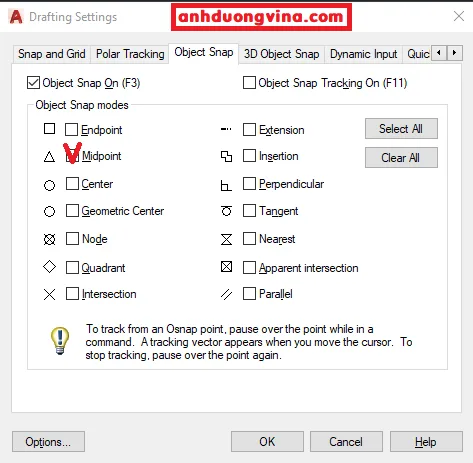 Bước 2 : Autocad sẽ hiện ra bảng Drafting Settings , ở bảng này bạn đánh dấu tick V vào ô có hình tam giác là MIDPONT sau đó thì chọn OK