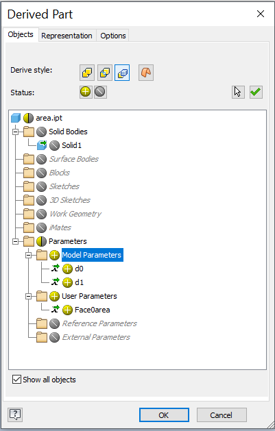 Để bắt đầu, bạn cần mở hộp thoại Derived Part. Đây là nơi bạn có thể quản lý và import các parameters từ các chi tiết khác.