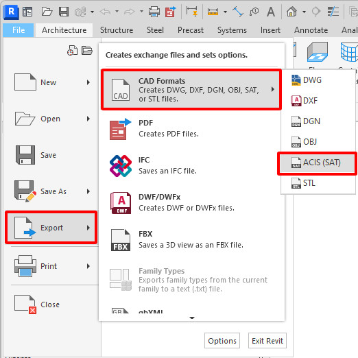 - Chọn Export > CAD Formats > SAT.
