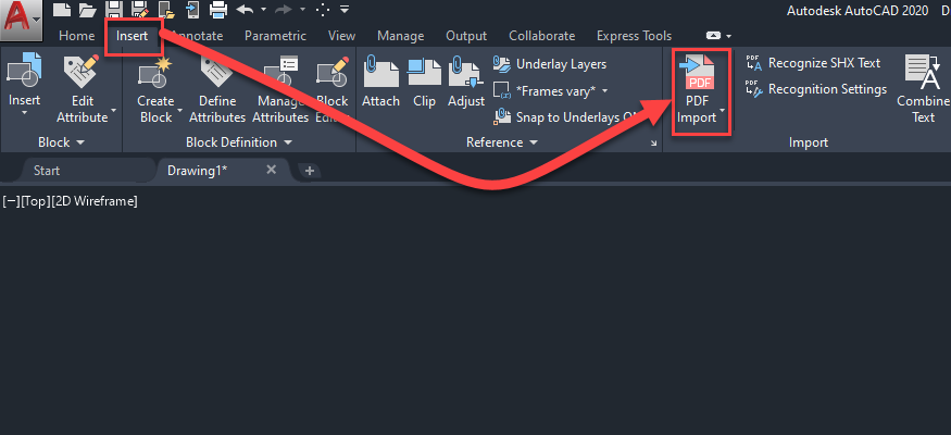 - Bước 1: Mở AutoCAD và vào tab Insert. Tại đây, chọn PDF Import.