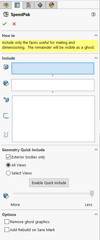 - Remove Ghost Graphics: Chỉ hiển thị các mặt, bộ phận và hình học được bao gồm trong SpeedPak. Nếu bỏ chọn tùy chọn này, bản lắp ráp sẽ hiển thị đầy đủ, nhưng khi di chuyển chuột, các đồ họa không cần thiết sẽ biến mất, chỉ giữ lại các thành phần đã chọn.