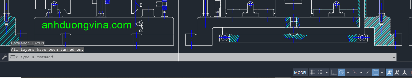 - LAYON được dùng để bật lại toàn bộ các layer đã bị tắt trong quá trình làm việc, giúp khôi phục bản vẽ về trạng thái hiển thị đầy đủ.