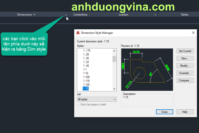 - Style: Danh sách các Dim Style đã có trong bản vẽ.