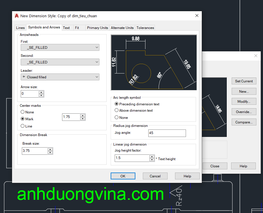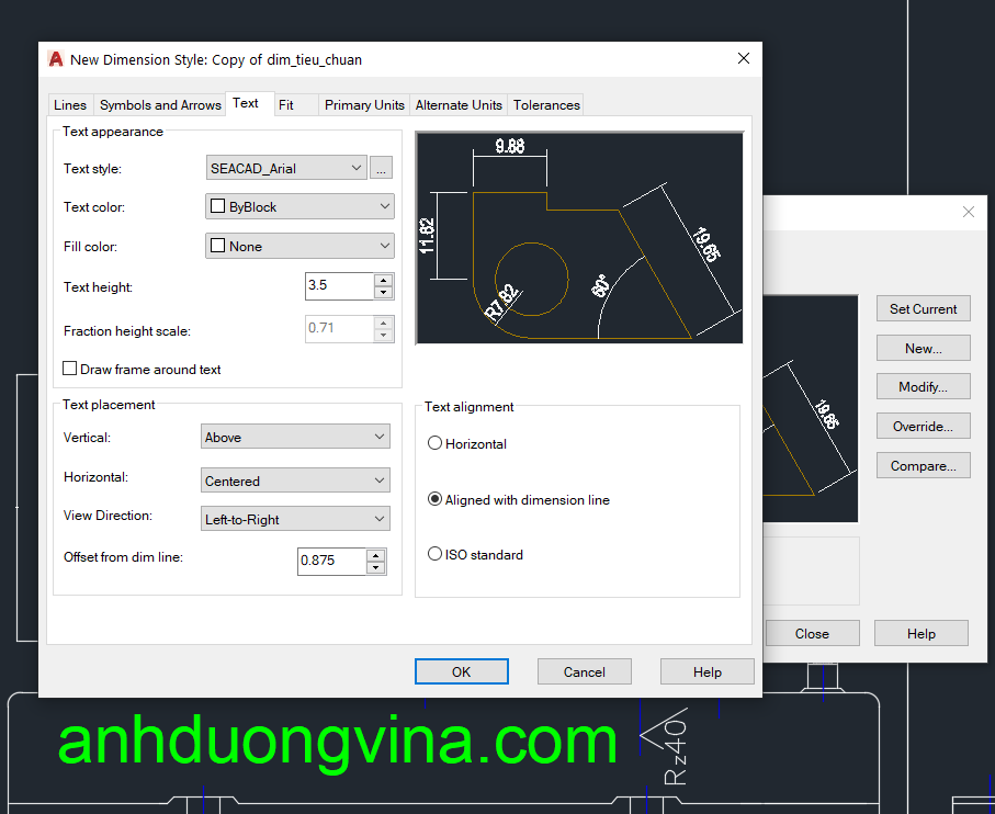 - Text Style: Chọn kiểu chữ cho chữ số đo, nên để chiều cao chữ trong Text Style là 0 để dễ dàng tùy chỉnh.