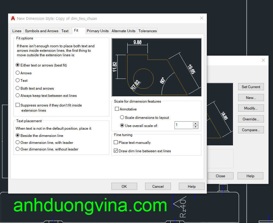 - Fit Options: Điều chỉnh vị trí của chữ số và mũi tên trong hoặc ngoài đường gióng tùy theo khoảng cách giữa hai đường gióng: