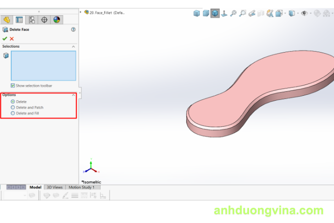 Lưu ý: Công cụ Delete Face chỉ có thể được mở khi bạn đang làm việc trong môi trường 3D Part của SOLIDWORKS.