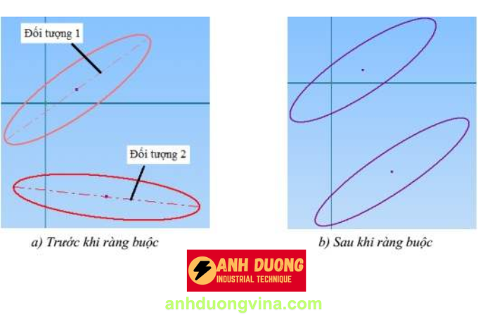 Tính năng: Ràng buộc hai đối tượng song song với nhau. Đối tượng này có thể là đoạn thẳng hoặc trục của elip. Công cụ này giúp đảm bảo rằng các đối tượng luôn duy trì mối quan hệ song song, bất kể các thay đổi khác trong bản vẽ.