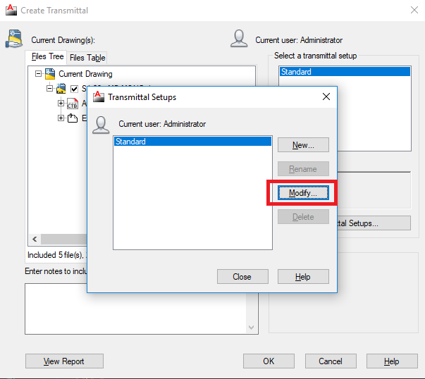 - Sử dụng nút Transmittal Setups để chọn các phần bổ sung cho bộ đóng gói.
