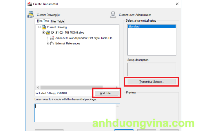 - Nhấn Transmittal Setups để mở hộp thoại cấu hình.