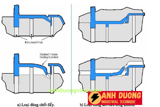 - Phụ thuộc vào kết cấu khuôn hoặc hệ thống đẩy cuống phun.