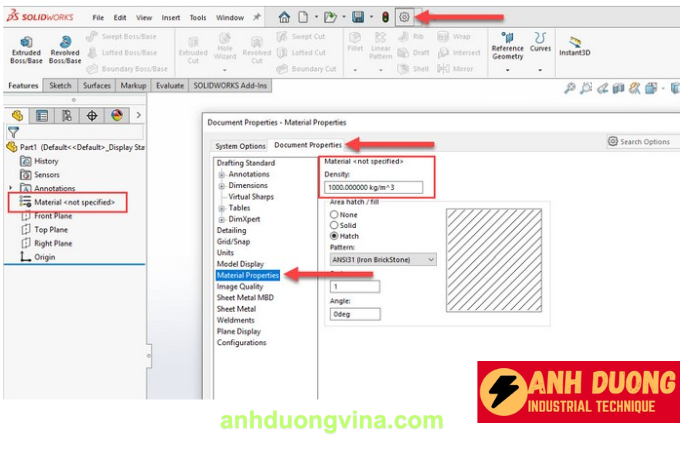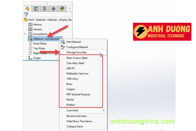 Trong quá trình thiết kế và xây dựng chi tiết 3D, việc thêm vật liệu chính xác không chỉ giúp tính toán thể tích và khối lượng một cách đáng tin cậy mà còn nâng cao hiệu quả làm việc. SolidWorks cung cấp một thư viện vật liệu phong phú, tuy nhiên, để thuận tiện hơn cho quá trình thiết kế, bạn có thể tùy chỉnh và tạo mục vật liệu ưa thích theo nhu cầu cá nhân. Hãy cùng anhduongvina.com tìm hiểu cách tạo mục vật liệu ưa thích trên SolidWorks qua các bước đơn giản dưới đây.