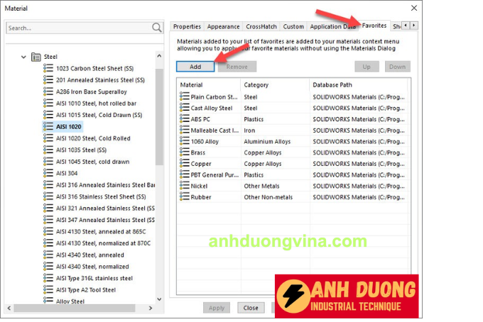 Hướng Dẫn Cách Tạo Mục Vật Liệu Ưa Thích trên SolidWorks