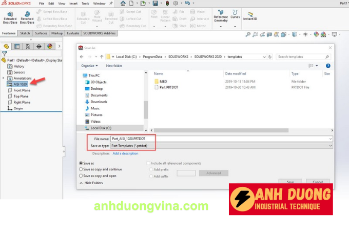 - Chọn SolidWorks Templates từ danh sách Save as type.