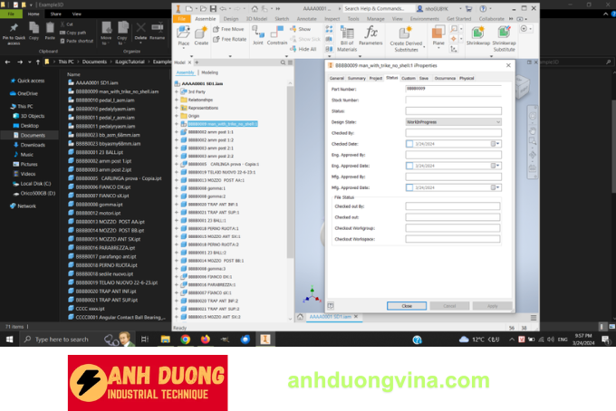 - Mở iProperties của từng Part và Assembly để xác nhận rằng Part Number và Title đã được cập nhật chính xác dựa trên tên file.
