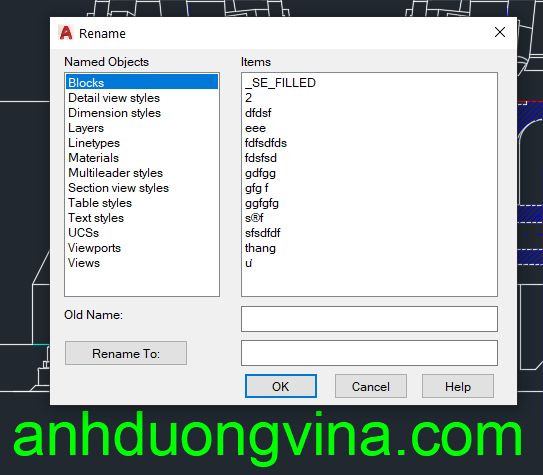 - Trong cửa sổ Rename, bạn sẽ thấy danh sách các loại đối tượng ở phía bên trái, bao gồm Blocks, Layers, Linetypes, Text Styles, và nhiều loại khác.