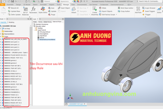 Việc sử dụng Rule để tự động cập nhật tên Occurrence trong Autodesk Inventor giúp bạn quản lý Assembly một cách chính xác và hiệu quả hơn, đặc biệt khi làm việc với số lượng lớn các bộ phận giống nhau. Bằng cách áp dụng script iLogic như hướng dẫn trên, bạn có thể giảm thiểu sai sót trong việc đặt tên và nâng cao hiệu suất làm việc trong quá trình thiết kế.