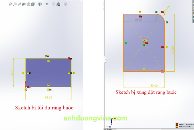 Dư ràng buộc xảy ra khi bạn cố gắng thêm kích thước hoặc ràng buộc hình học vượt quá mức cần thiết, dẫn đến xung đột giữa các ràng buộc trong sketch. Kết quả là sketch của bạn chuyển sang trạng thái Over Defined hoặc phần mềm thông báo No Solution Found.
