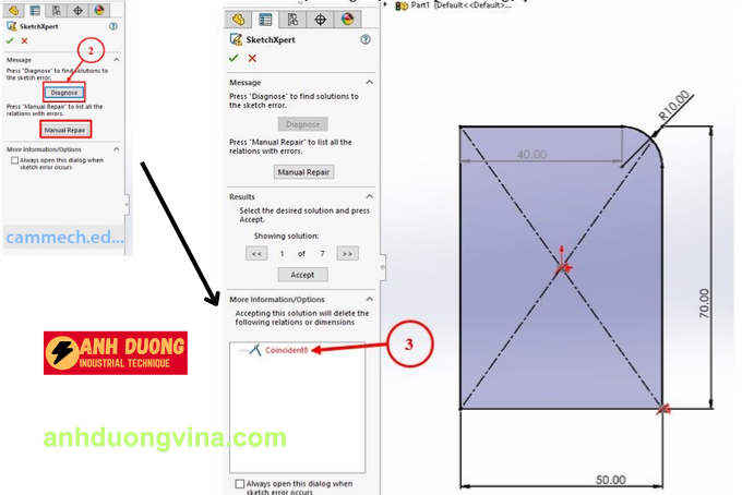 Công cụ Sketch Xpert trong SOLIDWORKS giúp bạn xử lý các lỗi ràng buộc một cách nhanh chóng và chính xác. Công cụ này có hai chế độ chính: Diagnose và Manual Repair, hỗ trợ phân tích và sửa chữa sketch bị lỗi.