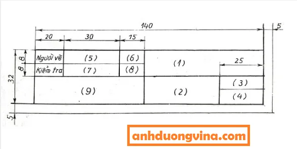 Dưới đây là mẫu khung tên căn bản mà bạn nào từng học qua môn vẽ kỹ thuật cũng sẽ biết mẫu khung tên này , thường các thầy giáo sẽ bắt chúng ta vẽ tay trước khi bắt đầu vẽ máy bằng autocad