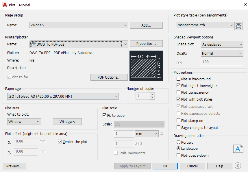 - Mục Name: Chọn “DWG To PDF.pc3” để in dưới dạng PDF.
