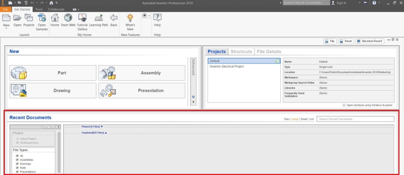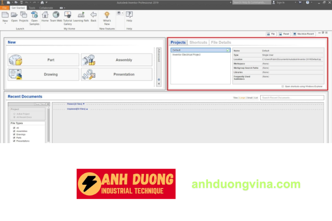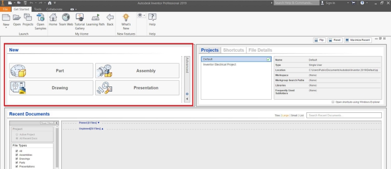 - Danh sách tệp gần đây: Hiển thị các tài liệu vừa được mở hoặc chỉnh sửa, bao gồm các tệp Part, Assembly, hoặc Presentation.