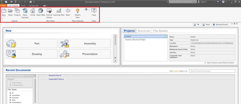 Khi bạn mở Inventor, màn hình chính sẽ được chia thành ba khu vực chính, với thanh menu nằm ở phía trên cùng.