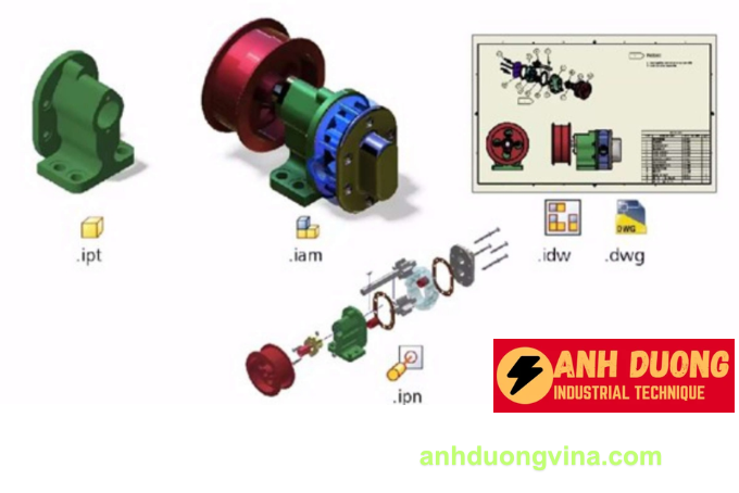 - Tệp Drawing (.idw, .dwg): Soạn thảo tài liệu kỹ thuật, bao gồm hình chiếu và chú thích.