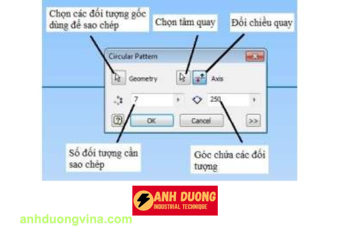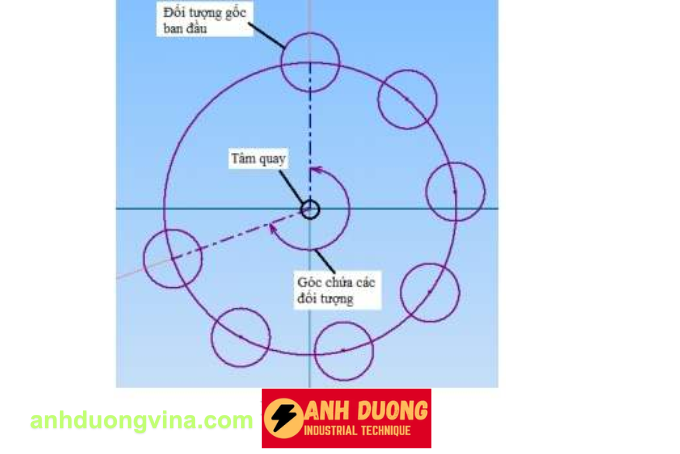 Công cụ Circular Pattern cho phép người dùng sao chép các đối tượng gốc thành nhiều đối tượng quay quanh một tâm xác định. Đây là công cụ hữu ích khi bạn cần tạo các bản sao đối xứng theo hình tròn, giúp tiết kiệm thời gian và đảm bảo tính chính xác trong thiết kế.