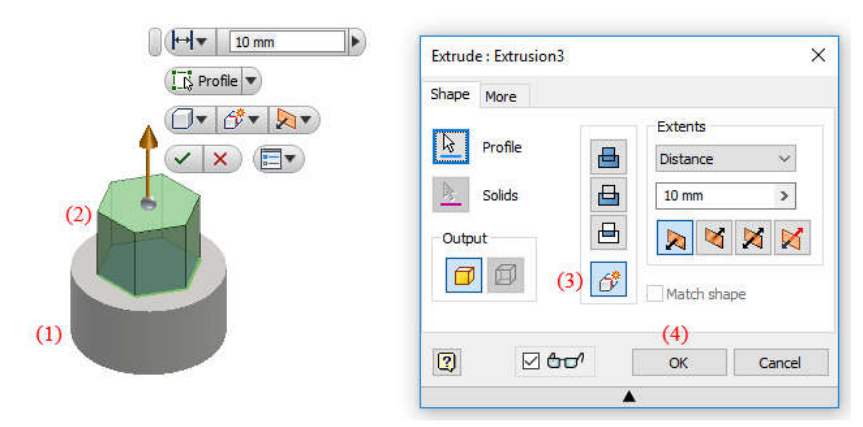 - Đối tượng kết hợp (Tool Body) phải được tạo riêng biệt. Khi thực hiện lệnh Extrude, bạn cần chọn tùy chọn New trong phần tạo khối mới để đảm bảo rằng đối tượng cần trừ được tạo ra độc lập.