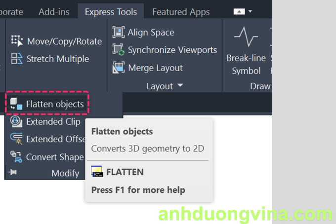 - Chọn tab Express → Modify → Flatten objects hoặc gõ lệnh