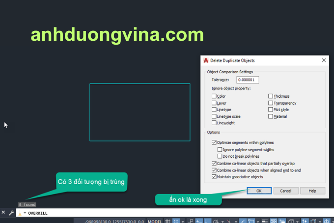 2. Các bước sử dụng lệnh OVERKILL để xóa đối tượng trùng