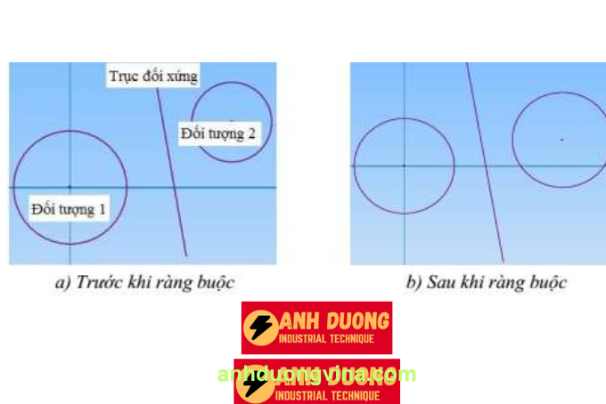 Công cụ Symmetric cho phép người dùng ràng buộc hai đối tượng sao cho chúng đối xứng nhau qua một trục xác định. Đây là công cụ hữu ích khi bạn cần tạo ra các phần tử đối xứng trong mô hình, giúp tăng tính thẩm mỹ và đảm bảo độ chính xác trong thiết kế.