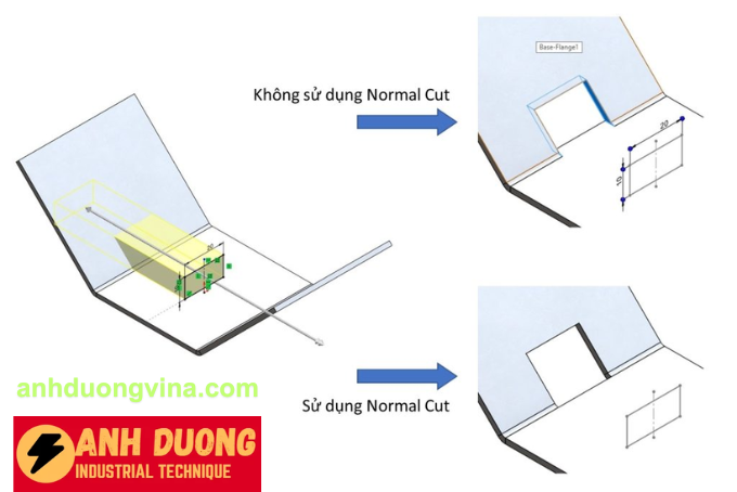 - Khi sử dụng Normal Cut, hướng cắt sẽ luôn vuông góc với bề mặt của tấm kim loại, đảm bảo rằng các lỗ hoặc rãnh được cắt đúng hình dạng khi sản phẩm được trải phẳng.